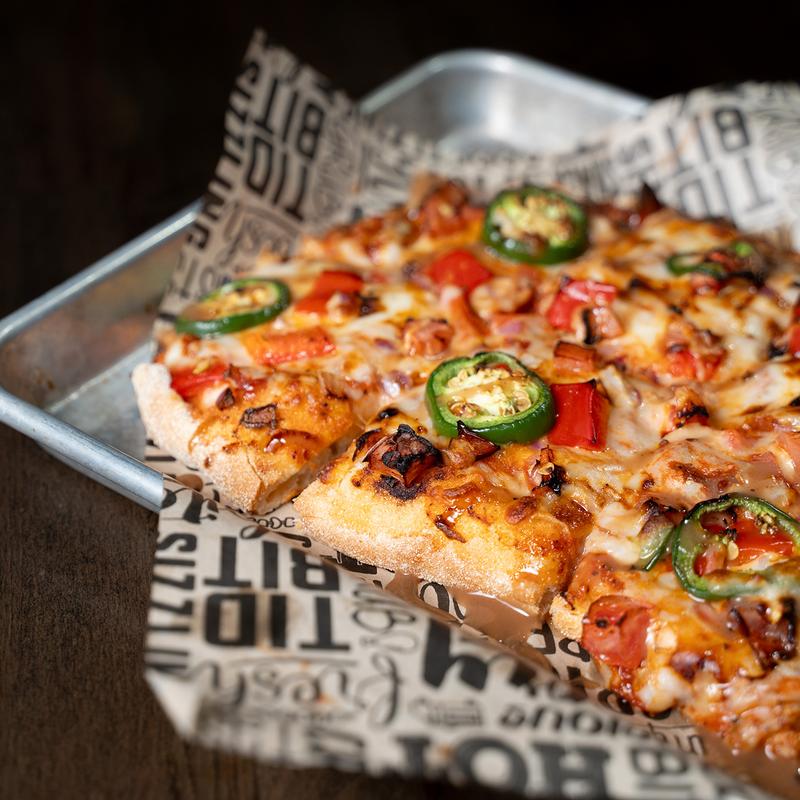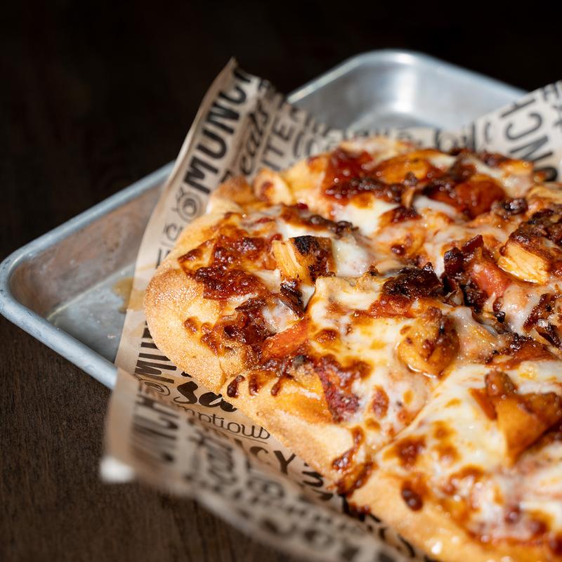 Marinara, pepperoni, bacon, chicken, cheese & hot honey drizzle.