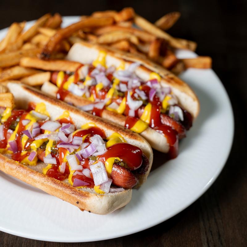 2 Sliced beef hotdogs, S&P, grilled, choose 3 toppings.