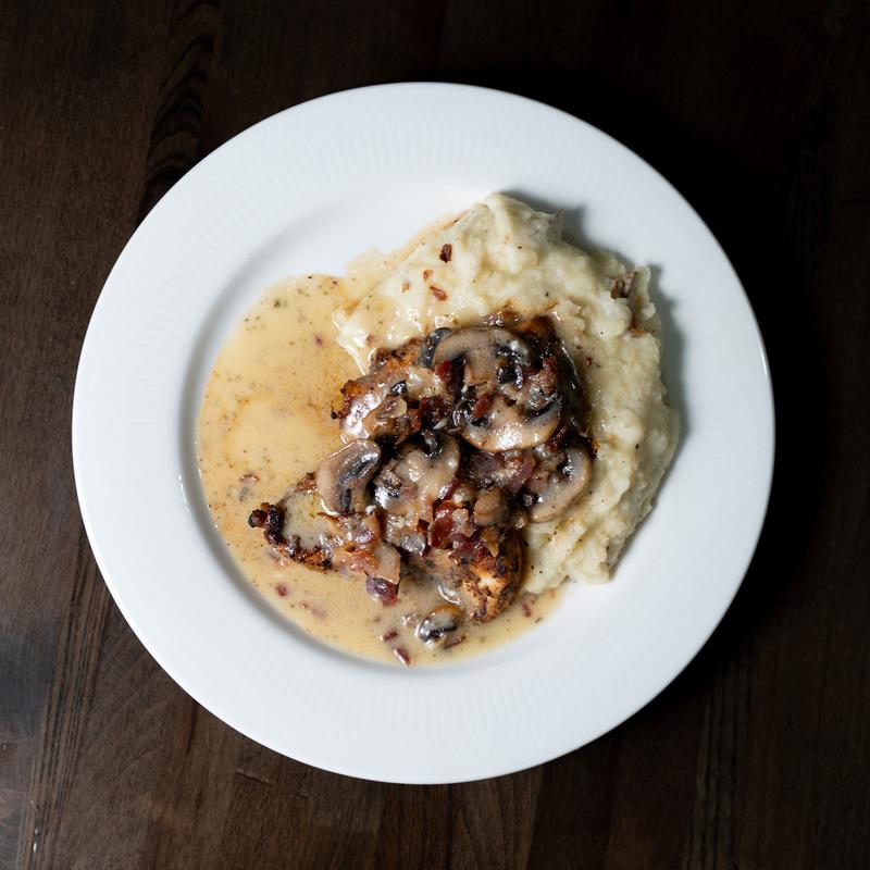 Grilled chicken topped with mushrooms, bacon & cheese over garlic mashed potatoes & a premium side.